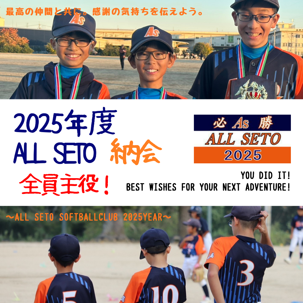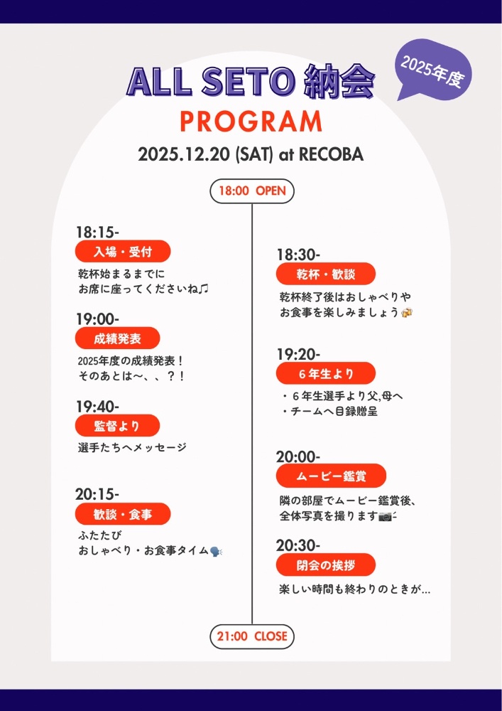 コーチ・御父母の皆様、チーム運営に多大なる御協力を賜り、深く感謝申し上げます。この度、3名の6年生が、12月20日をもって「ALL SETO」を卒団します。ささやかながら今年1年間チーム活動お疲れ様でしたの意味も込めて、全員が主役となり、今まで頑張ってきた6年生を全員で囲みましょう✌️